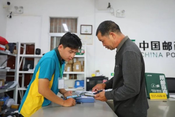 在平孟郵政所內(nèi),黃河振耐心協(xié)助村民查看取件信息