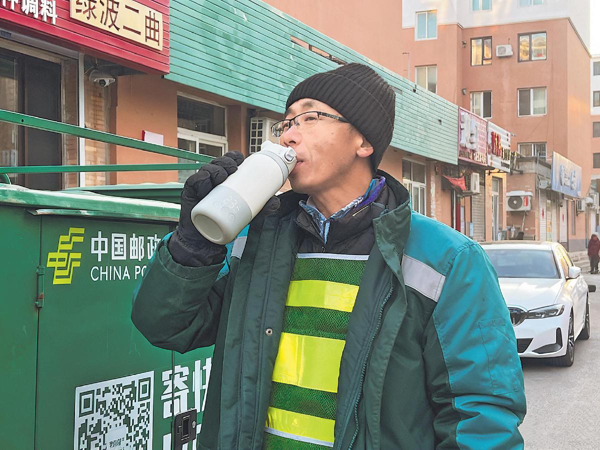 投遞路上,攬投員李洪巖用上了工會(huì)送來(lái)的生日禮物。□劉柏君 攝