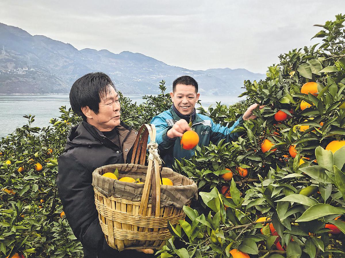 奉節(jié)郵政工作人員上門服務(wù),與果農(nóng)一起采摘臍橙。