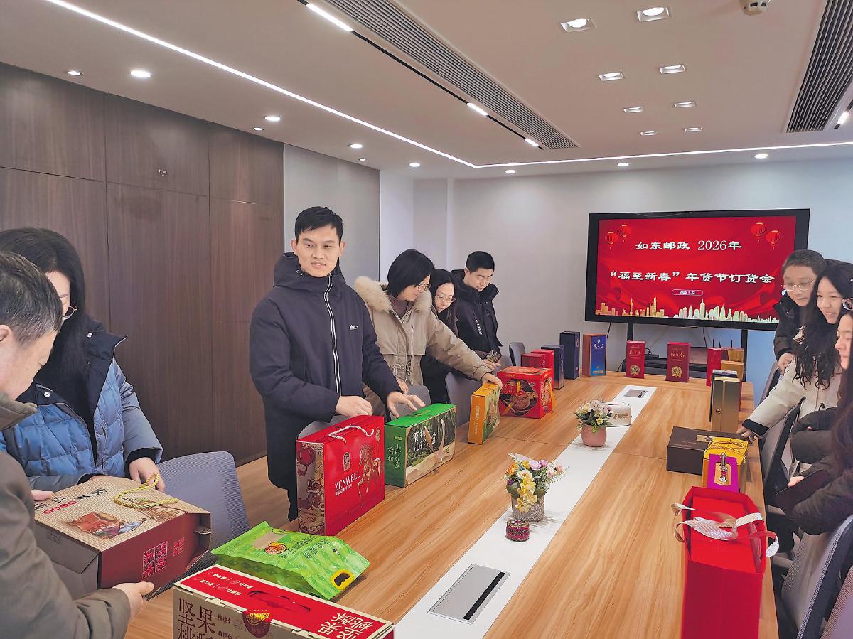 在年貨訂貨會(huì)上,如東郵政為企業(yè)提供個(gè)性化訂購方案。 □陳銳 攝