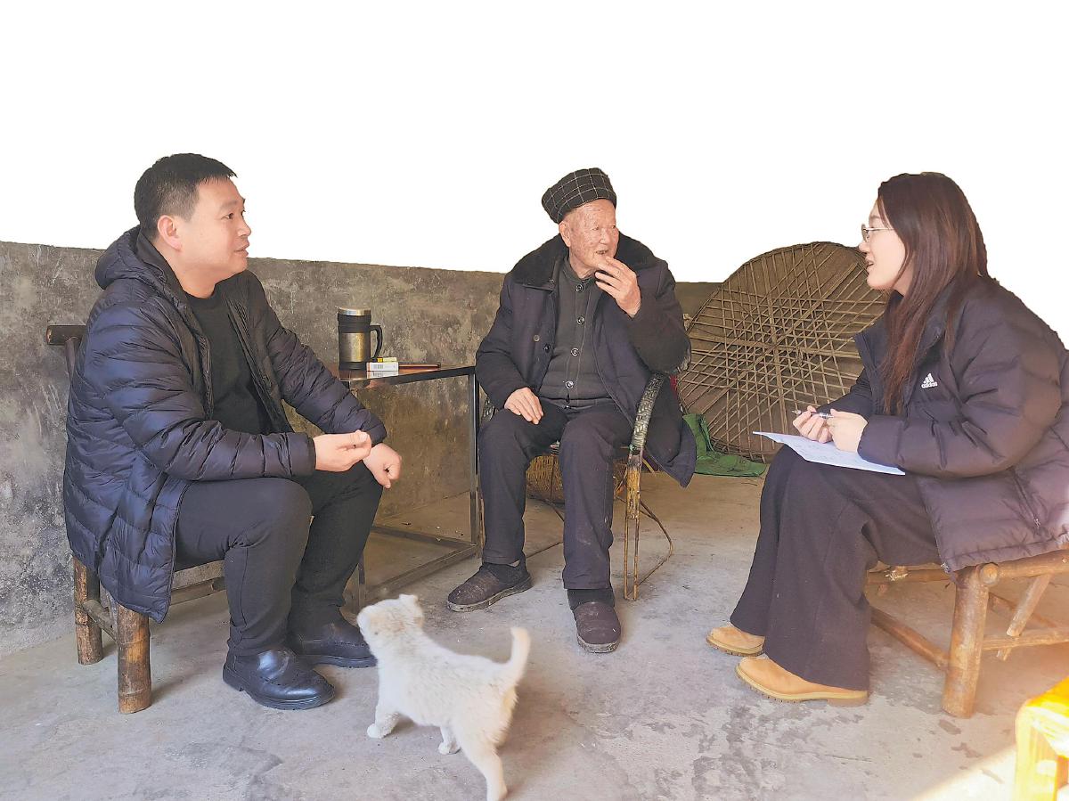 記者(右一)在農戶家中采訪。□肖嬋 攝