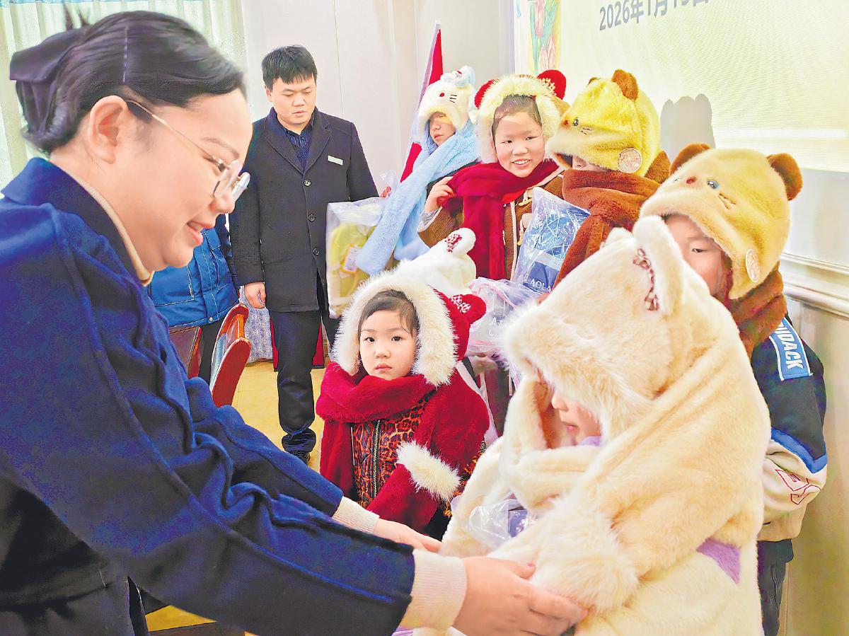 巴南郵政青年志愿者為孩子們送上保暖衣物。