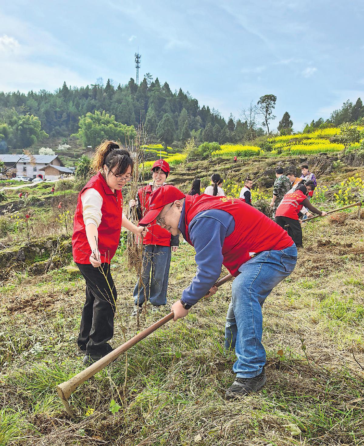 重慶市南川區(qū)郵政分公司黨總支聯(lián)合團(tuán)區(qū)委、水江鎮(zhèn)黨委開展黨建共建活動(dòng),組織黨團(tuán)員志愿者走進(jìn)下樂村,開展春季義務(wù)植樹。大家共栽種桃樹、櫻花樹300棵,踐行了綠色發(fā)展理念,生動(dòng)展現(xiàn)了“綠色郵政”的良好形象。□趙娟 攝影報(bào)道