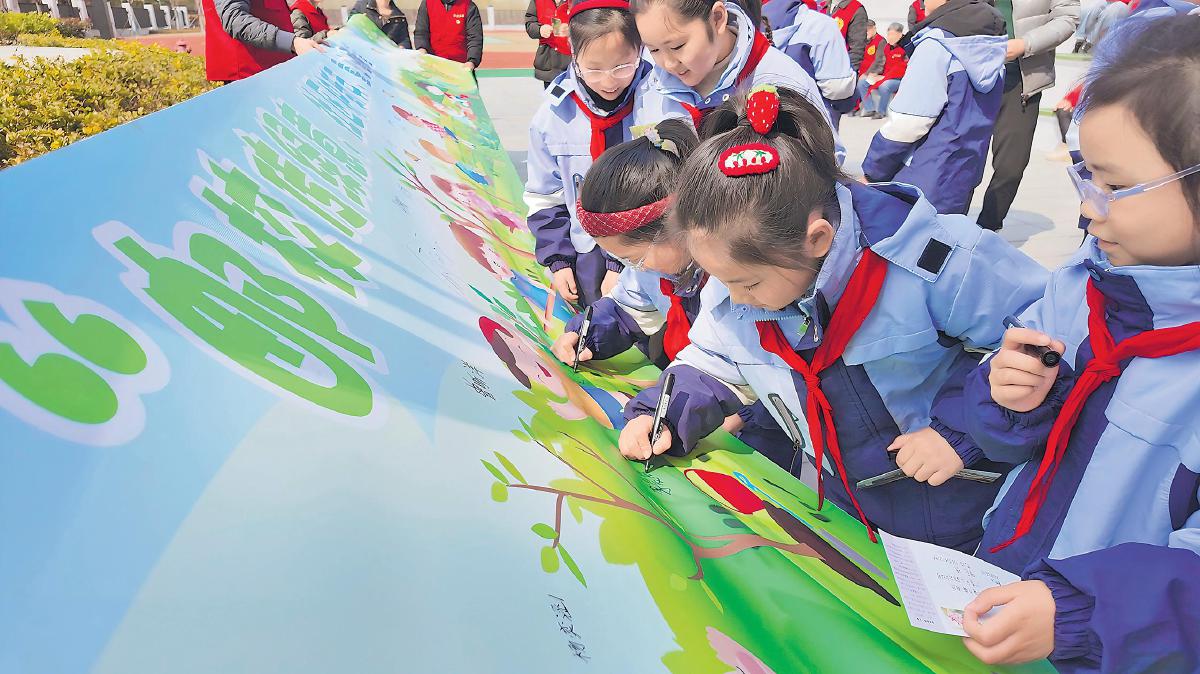 江蘇省南通市海門區(qū)郵政分公司聯(lián)合海門街道城北社區(qū)、張謇小學(xué)開展“郵校傳綠意 社區(qū)護(hù)新芽 童心植希望”主題實(shí)踐活動(dòng)。活動(dòng)現(xiàn)場,孩子們齊聲宣讀“愛綠護(hù)綠”倡議書,聯(lián)手繪制8米長“綠色畫卷”,以稚嫩筆觸勾勒青山綠水、鳥語花香的生態(tài)圖景,隨后投出“美麗海門”明信片,將綠色寄語寄往未來。□王歡 攝影報(bào)道