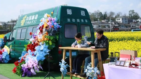 “金海雪山”因春季油菜花與漫山李花交相輝映而得名。今年,貴定郵政在去年基礎上優化服務,依托郵政流通服務車,將郵局搬進了花海。現場劃分出打卡拍照區、文創展示區、明信片書寫寄遞區和助農產品銷售區,讓郵政文化與田園風光融為一體。