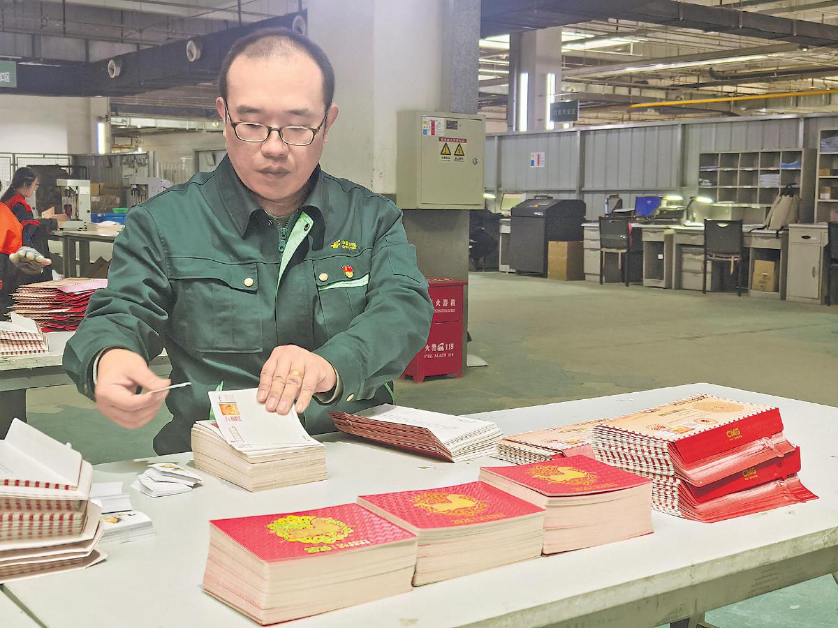 手工封裝車間是最忙碌的區域之一?!胺夂眠@條不到20厘米長、不足2厘米寬的封舌,其實很考驗功夫。封口不牢,郵寄途中可能散開;膠水多了,又可能粘連郵戳或地址。所以,每一封都得手工操作,膠水量必須恰到好處。”手工封裝車間班長馬寅東介紹起團隊的獨門訣竅。他帶領團隊在信封到貨后反復測試,摸索出最合適的膠水用量和晾干時間。在封裝過程中,工作人員還要逐一核對明信片數量和附帶的貼紙,輕輕按壓封口,確保嚴絲合縫,再整齊擺放、晾干后分批裝箱。