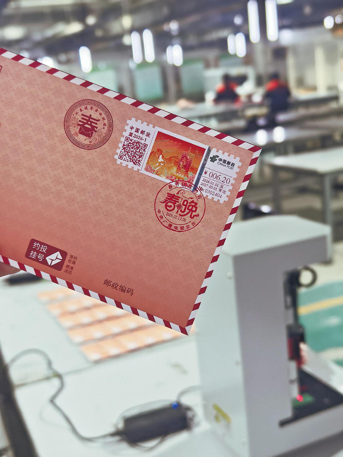 自1月初至除夕當天,所有通過線上下單的“2026年春晚寄?!奔o念封套裝,正陸續在這里完成打印、封裝、蓋戳和郵寄。