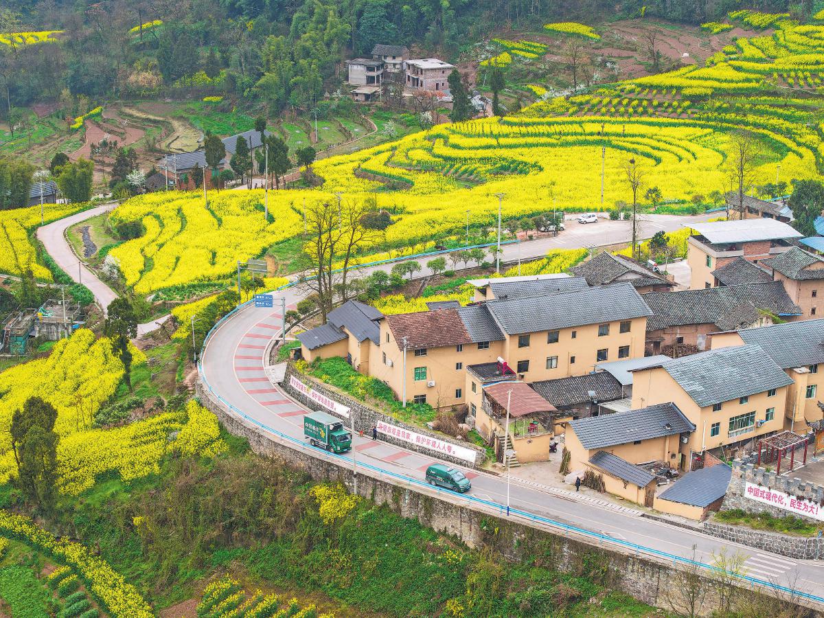 3月13日,巴渝梯田鋪金浪,郵車穿行其間,將春耕物資送往武隆區廟埡鄉,為農戶穩產增收注入郵政力量。 □王金莊 攝
