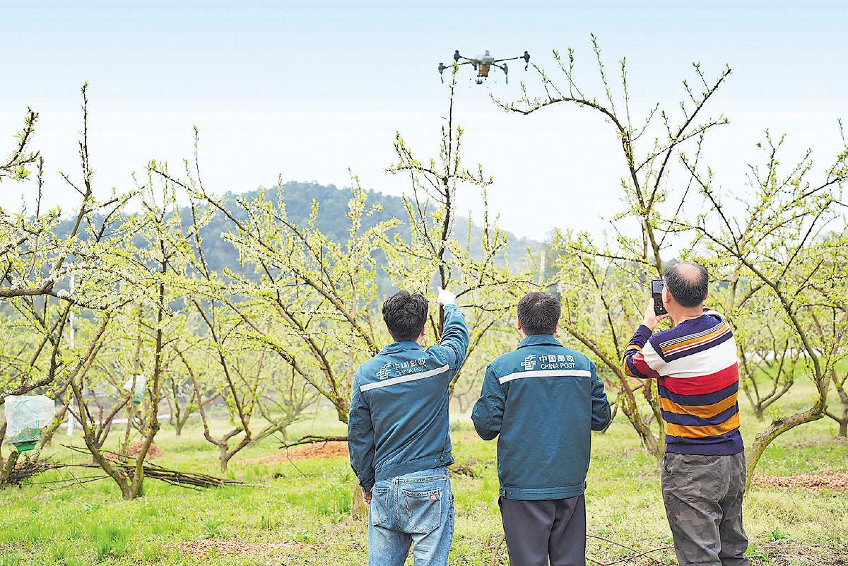 3月12日,江津區郵政分公司工作人員在柰李基地開展無人機植保作業,助力果樹增產。 □王春蘭 攝