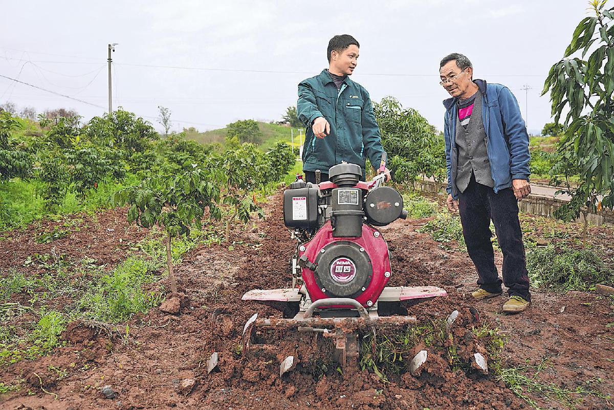 3月12日,江津區郵政分公司工作人員在油溪鎮大坡村為村民講解耕地機操作,以科技賦能春耕生產。 □王春蘭 攝