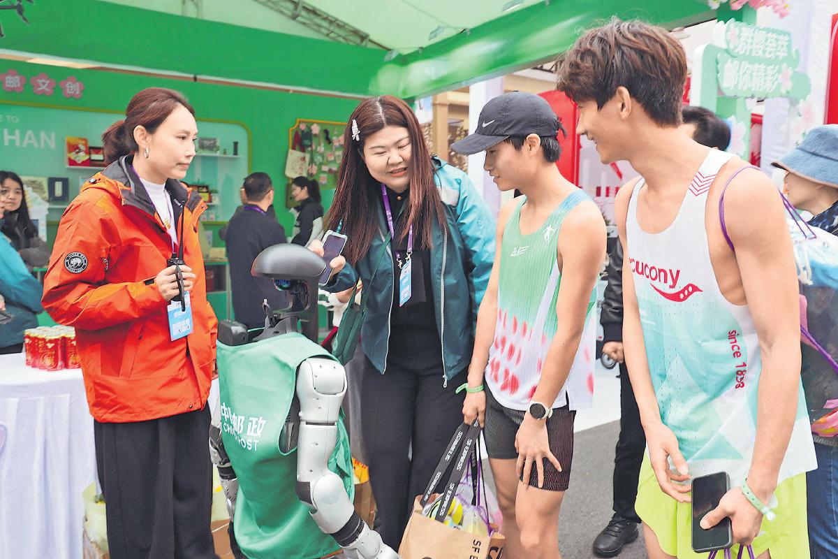臨時郵局里,互動體驗區、集章打卡區、文創展示區、跑友休息區一應俱全,多維度、全方位、有溫度的郵政服務,讓這里成為完賽跑友爭相打卡的熱門地點。比心、握手、跳舞……身著“郵政綠”馬甲的智能機器人與郵政專屬代言人“郵小櫻”“郵小政”一道,在臨時郵局前熱情互動,瞬間成了現場的“頂流明星”,引得跑友紛紛舉起手機與其合影。19次登上央視春晚舞臺的武漢郵政藝術團也用動感十足的舞蹈、激情歡快的歌聲燃動全場氛圍,讓跑友真切感受到武漢的熱情和郵政的用心。