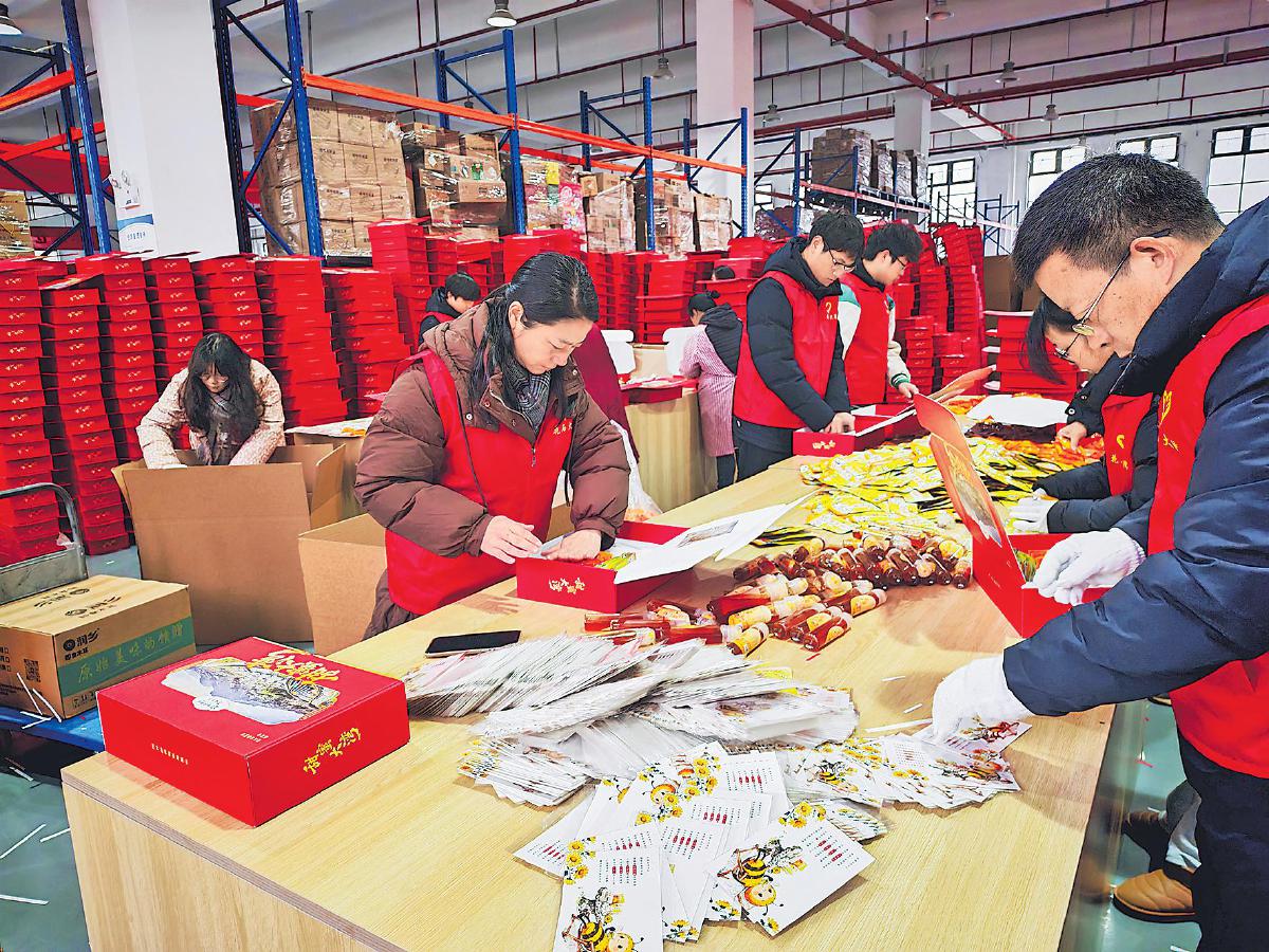 今年1月,金寨郵政和花石鄉(xiāng)政府抽調(diào)人員幫扶合作社組裝“甜蜜大灣”禮盒2.5萬(wàn)份。
