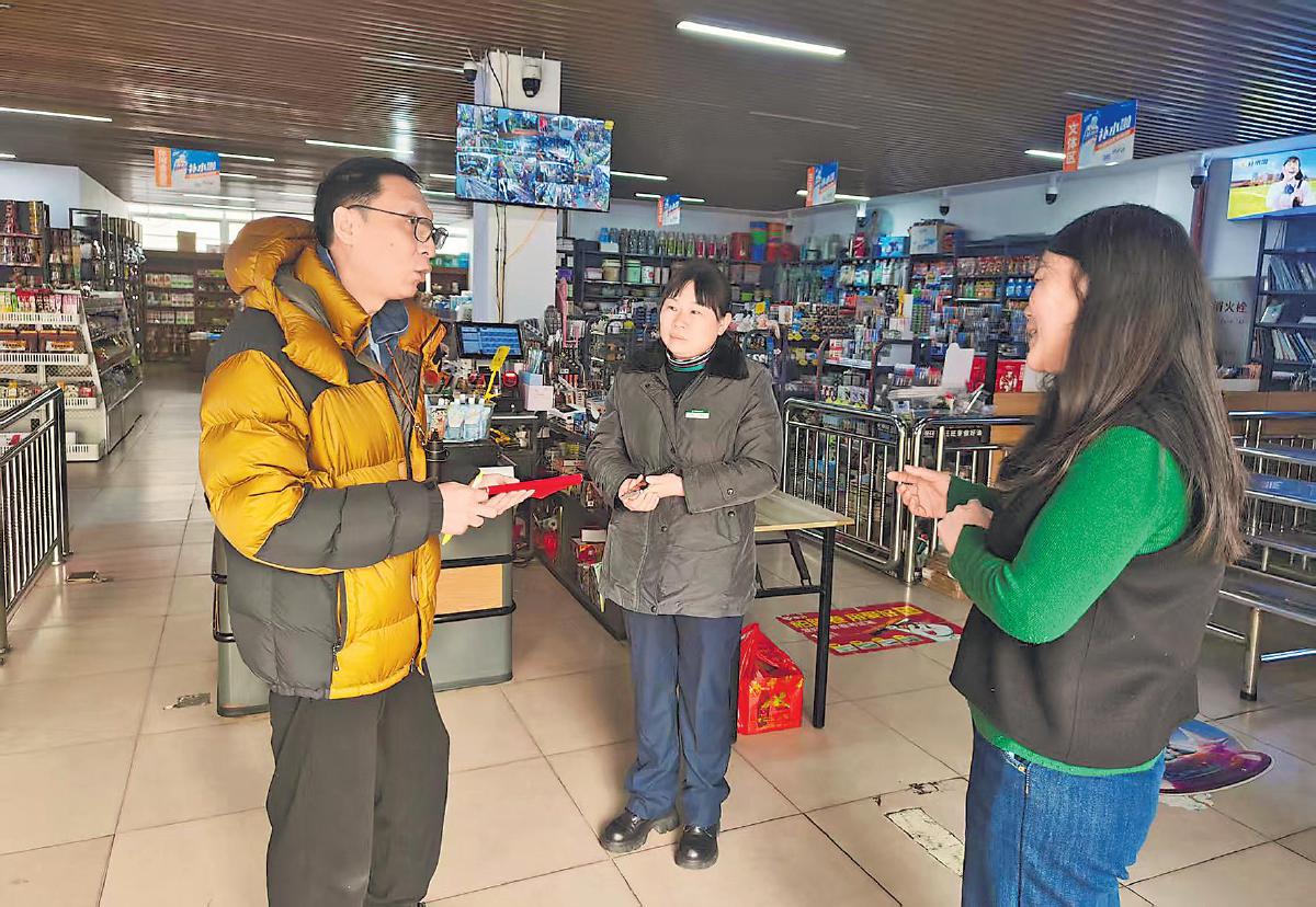 記者(左一)與朱桂華(中)一同走訪商超客戶。□彭紅坤 攝