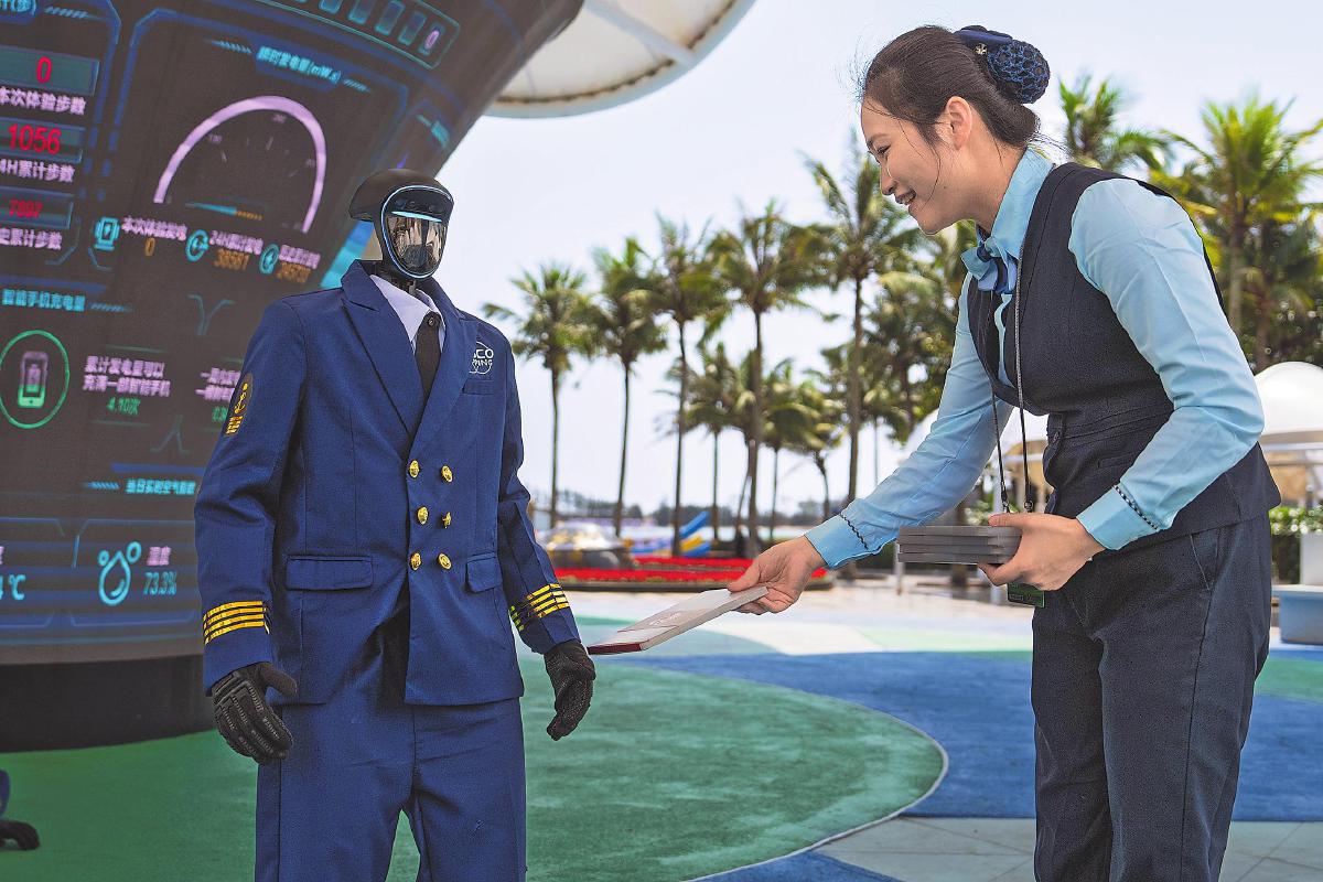 郵政工作人員與服務博鰲年會的智能機器人現場互動。 □陳師 攝