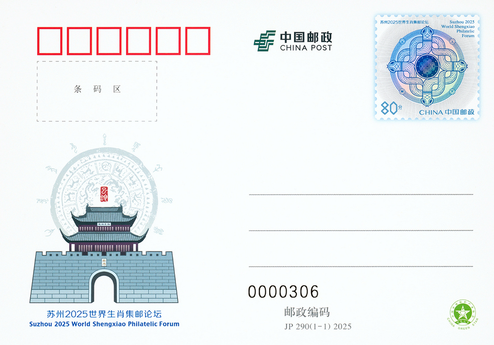 中國郵政定于2025年2月15日發行《蘇州2025世界生肖集郵論壇》紀念郵資明信片1套1枚。詳情如下: