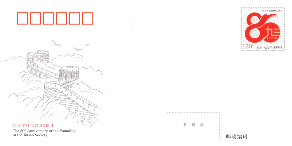 中國郵政定于2025年9月3日發行《九三學社創建80周年》紀念郵資信封1套1枚。詳情如下:
